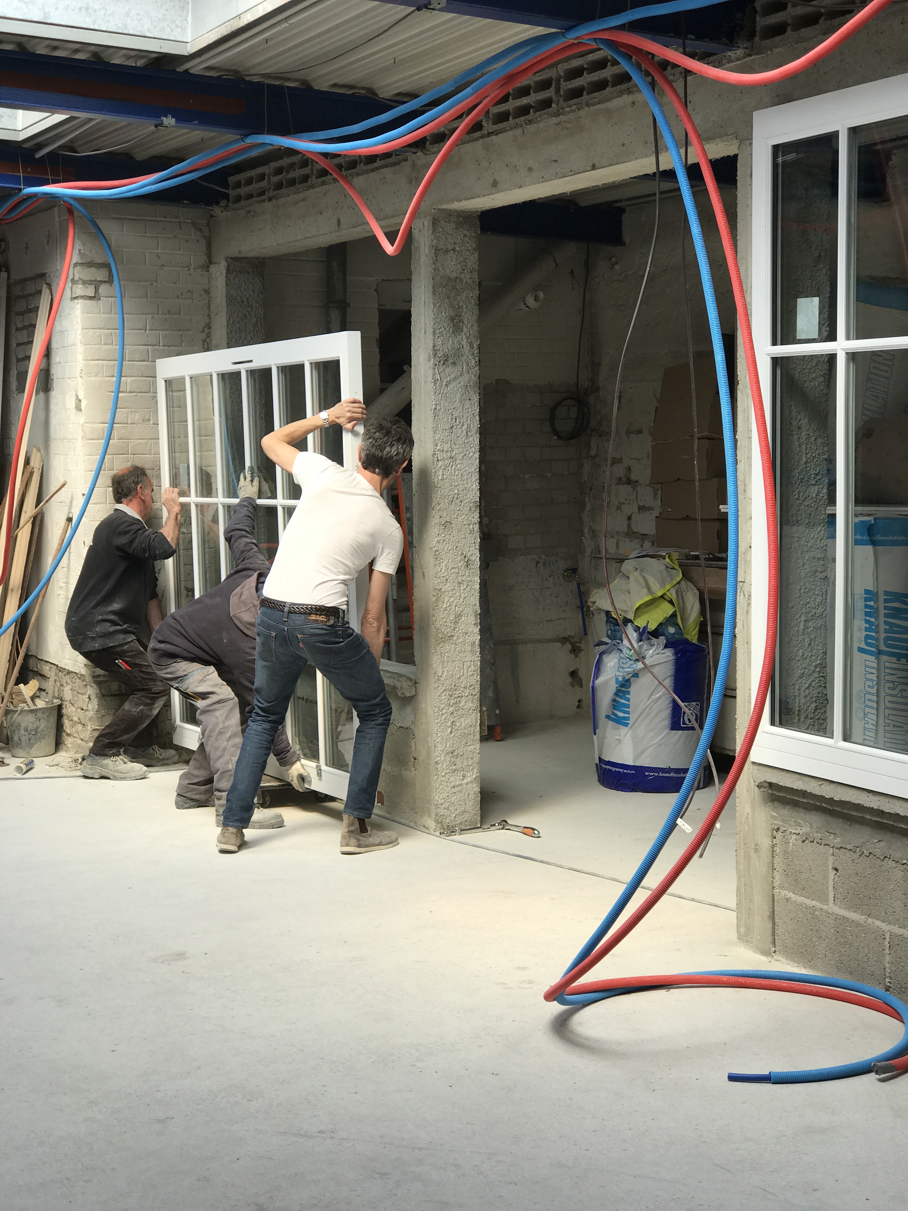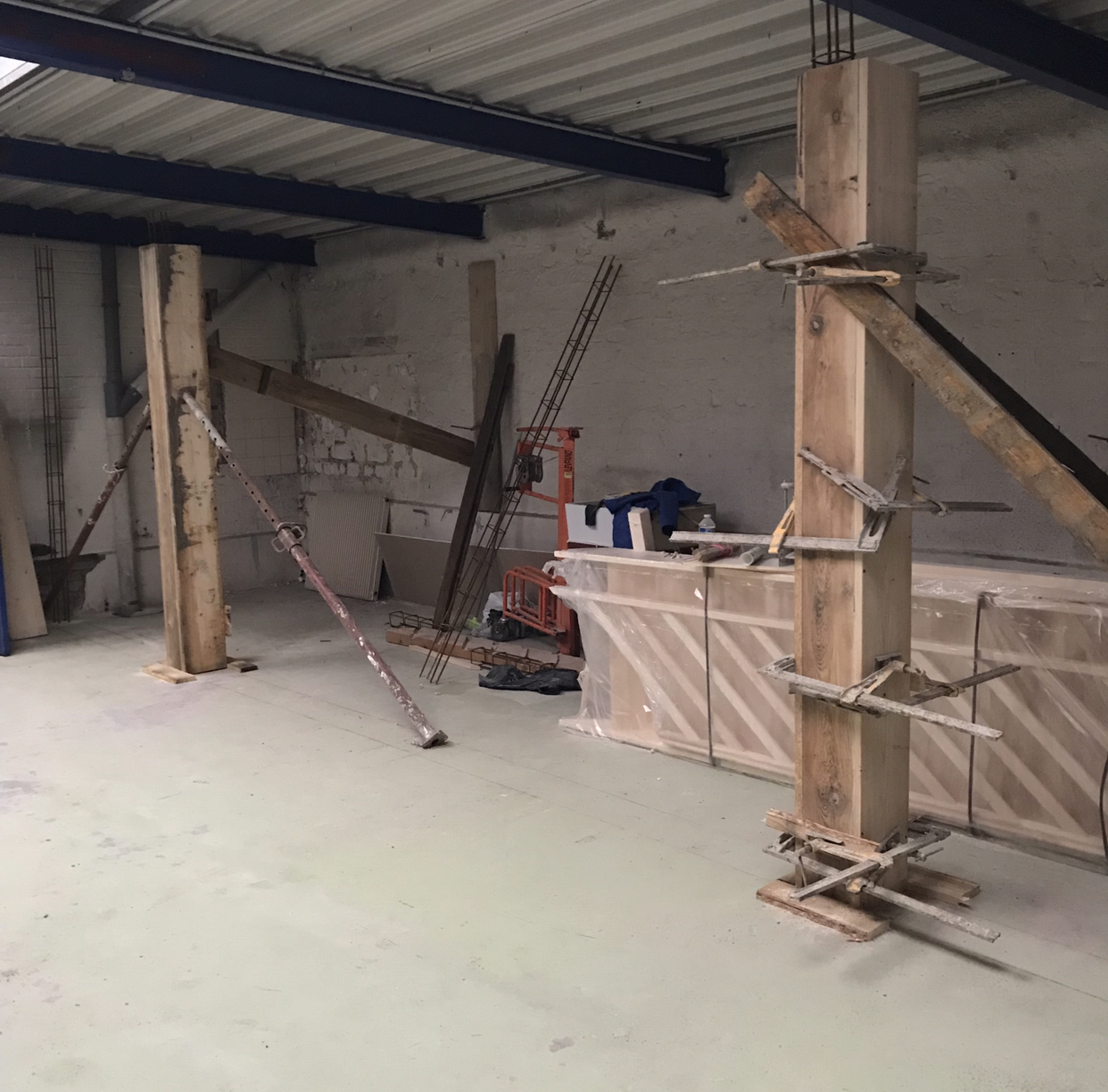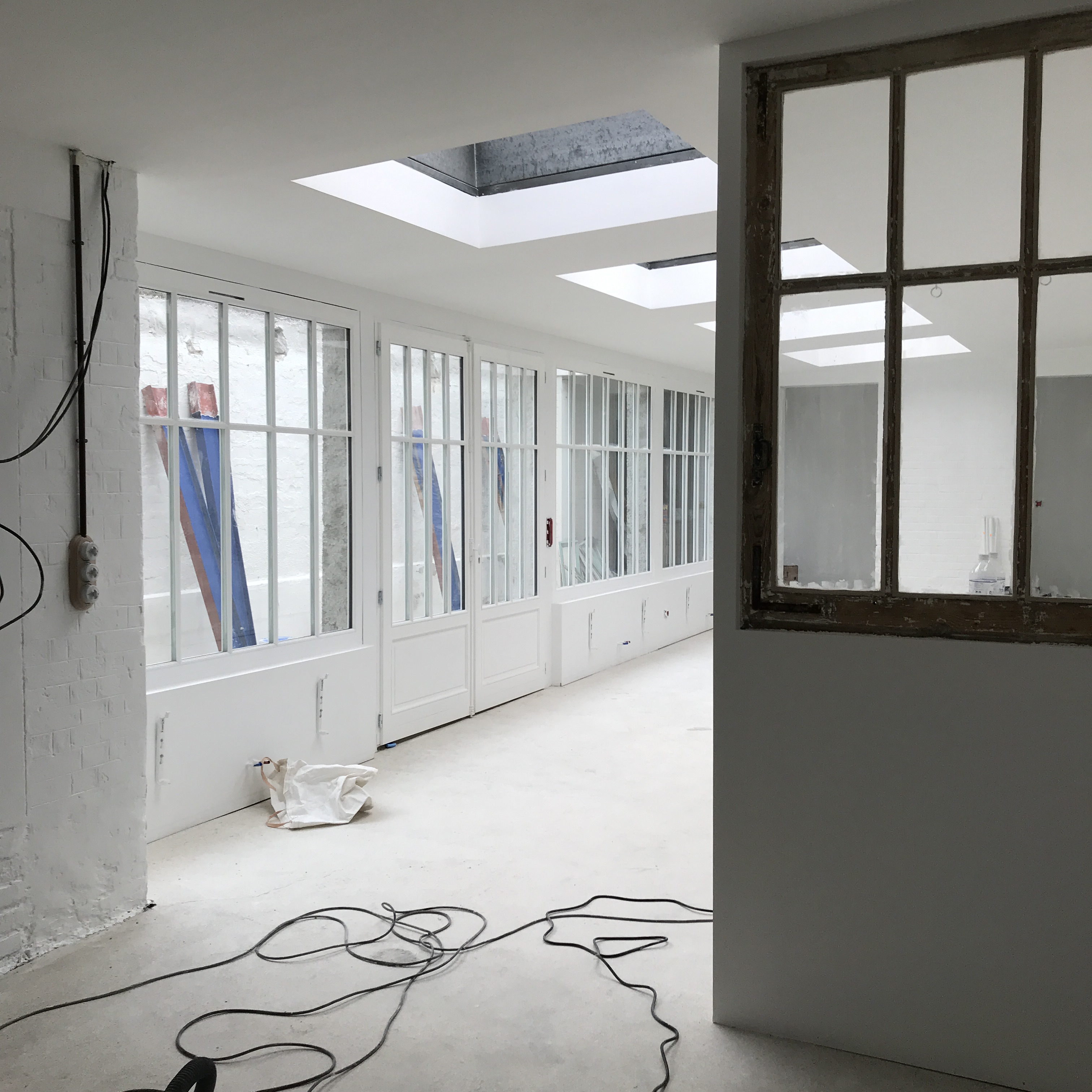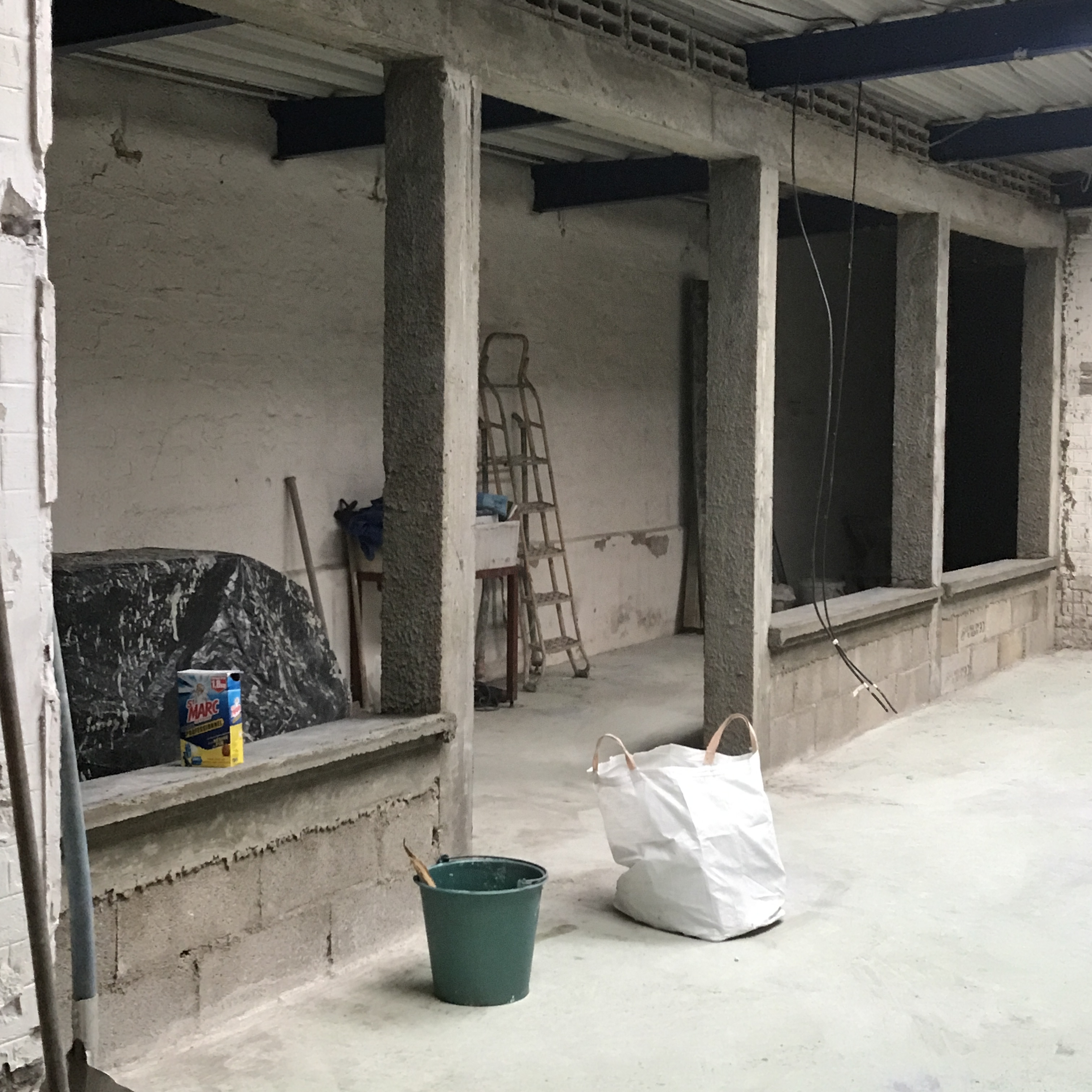 Dans cet espace, il a fallut concevoir une structure qui allait accueillir un grande verrière et porte sur-mesure. Toute la structure a été réalisé en béton, poteaux et soubassement.