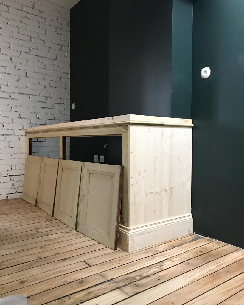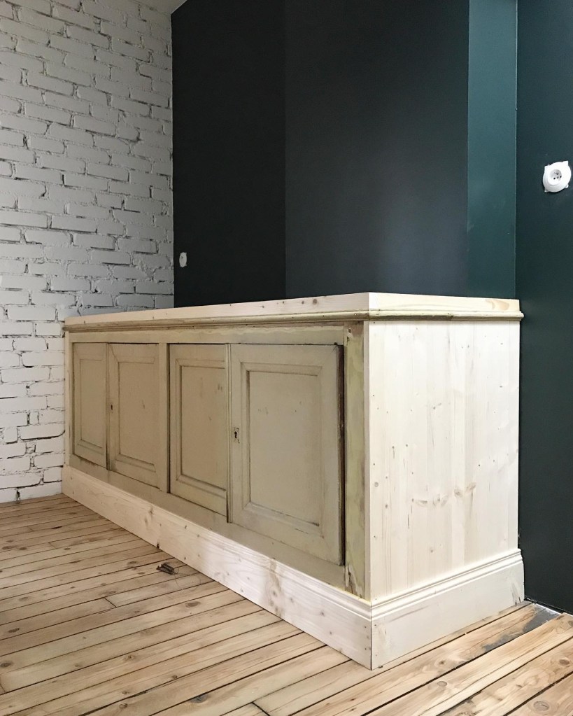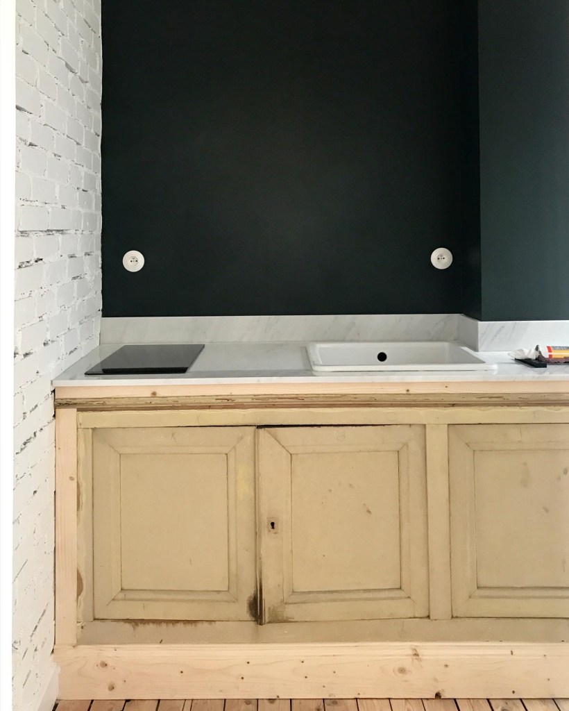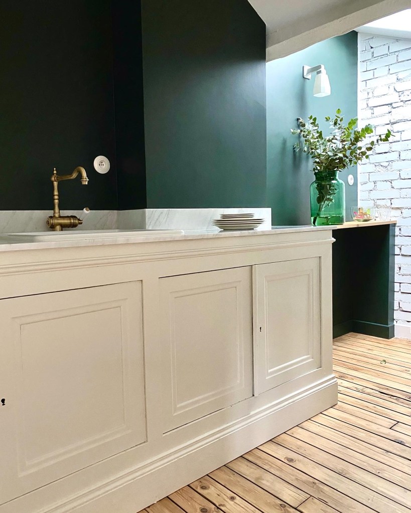 ★ Ici, une astuce pour créer une cuisine unique, dans un petit espace, à moindre coût – chinez une enfilade, rehaussez la en finissant par une belle plinthe moulurée et posez un plan de travail en pierre (ici plaque de marbre chinée). Installez évier en porcelaine chiné ou acheté dans le commerce et un robinet style rétro.