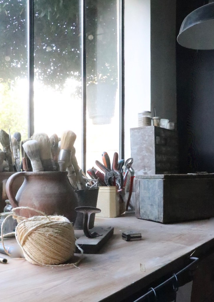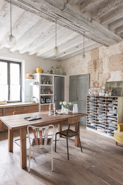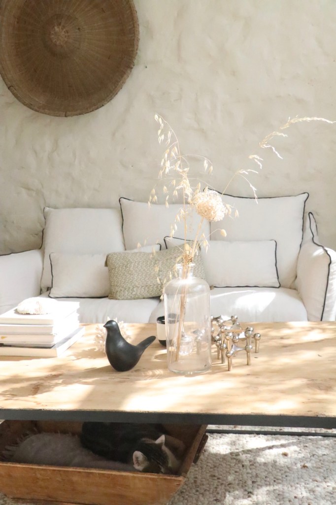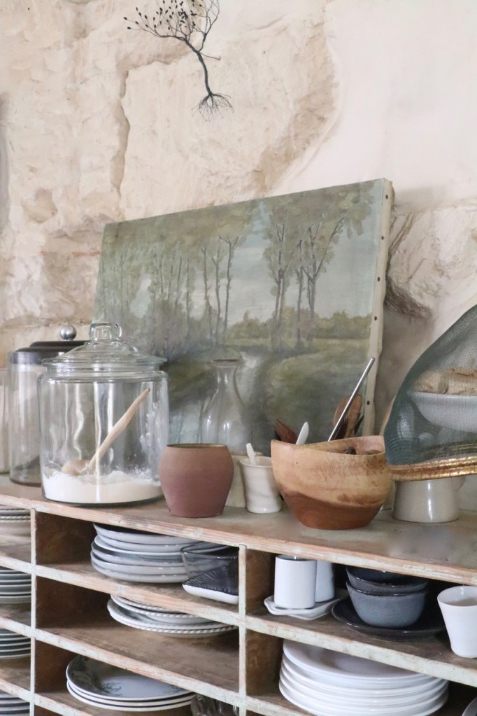 La cuisine est le cœur de la maison, il faut la chiader : une maison qui sent la bonne nourriture, où les plantes aromatiques ornent les fenêtres, une grande table pour cuisiner, recevoir, jouer, prendre un café… un endroit où l’on a envie de s’installer à table… j’aime que ma déco soit accessible et en rien fragile ou précieuse: tout est marqué par le temps, tout est là pour être utilisé, manié et on prend plaisir à utiliser les choses car elles sont jolies et ont souvent une histoire… les couverts en argent de ma grand mère, une passoire ancienne mais si jolie, de la vaisselle chinée… j’aime que les meubles changent de place et que la déco soit évolutive en fonction de nos besoins et de l’utilisation que l’on en fait. Je bouge mes meubles en hiver pour les rapprocher du poêle, je crée des coins de lecture cocon près des radiateurs, au printemps j’orne tous mes vases et bro de fleurs ramassées, en été je sors les meubles, coussins et sofa cover pour les utiliser sur la terrasse, je ne vernis pas mes plateaux de table : j’aime que le bois se patine avec le temps.. j’aime sentir que ma maison vit.