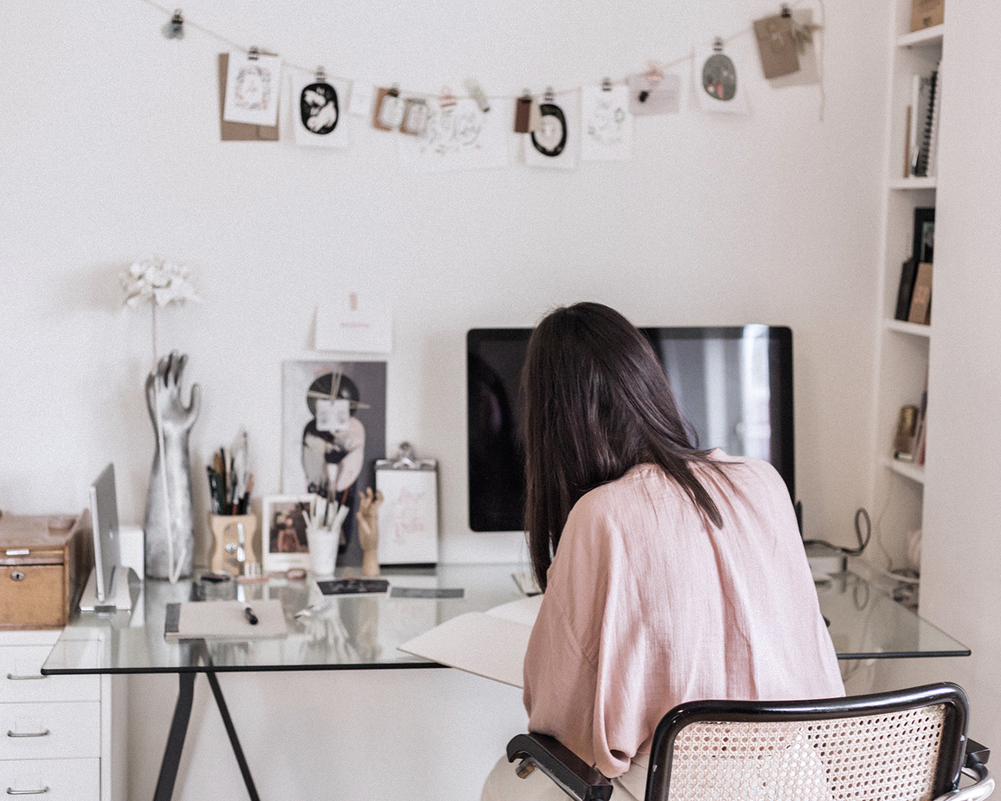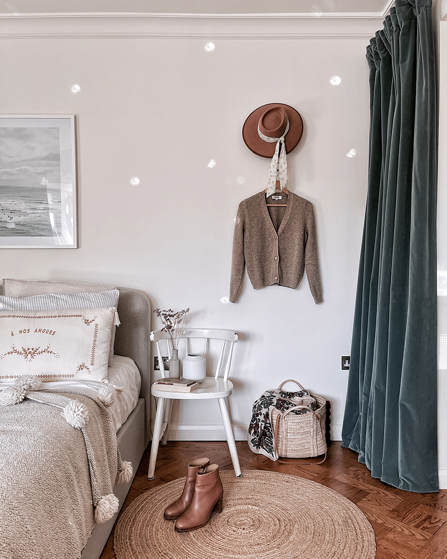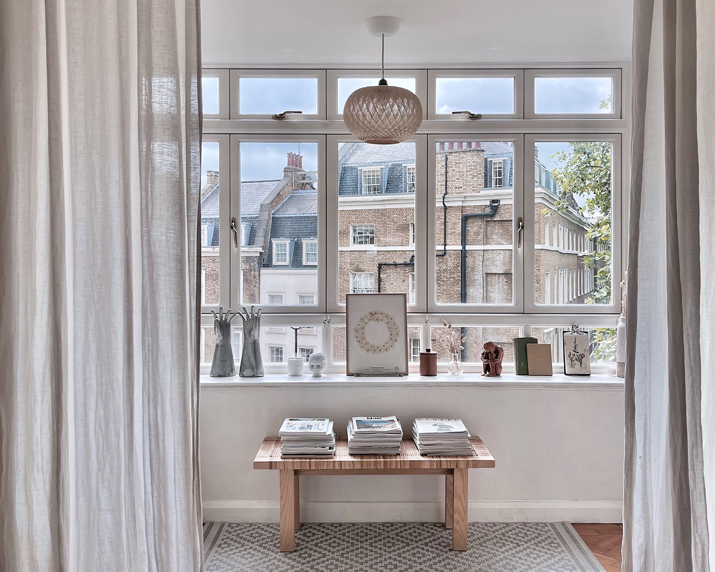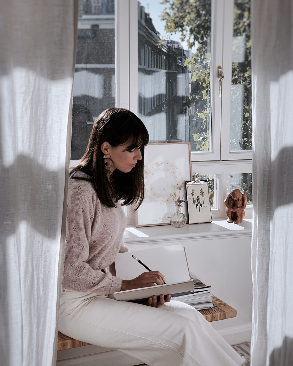 Aujourd’hui, la décoration de notre appartement est plutôt épurée, vintage et douce avec des meubles courbes qui cassent parfaitement le coté anguleux des volumes et des fenêtres de l’espace. Comme je travaille de chez moi, j’ai besoin de lumière mais aussi d’une certaine forme de neutralité dans mon intérieur. Je fais attention de ne pas surcharger l’espace. Je trouve que cela est plus propice à la créativité, à l’inspiration. Je n’accroche donc pas beaucoup de choses aux murs, mais j’aime accumuler sur les rebords des fenêtres ou les étagères, objets vintages ou insolites, peintures ou esquisses et souvenirs de nos voyages.