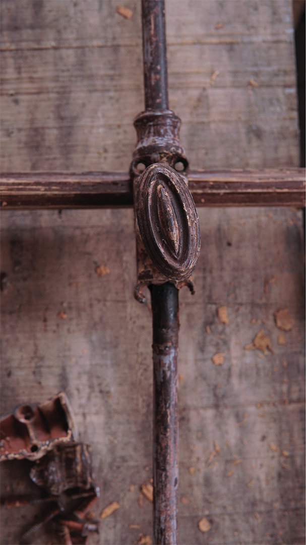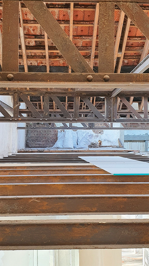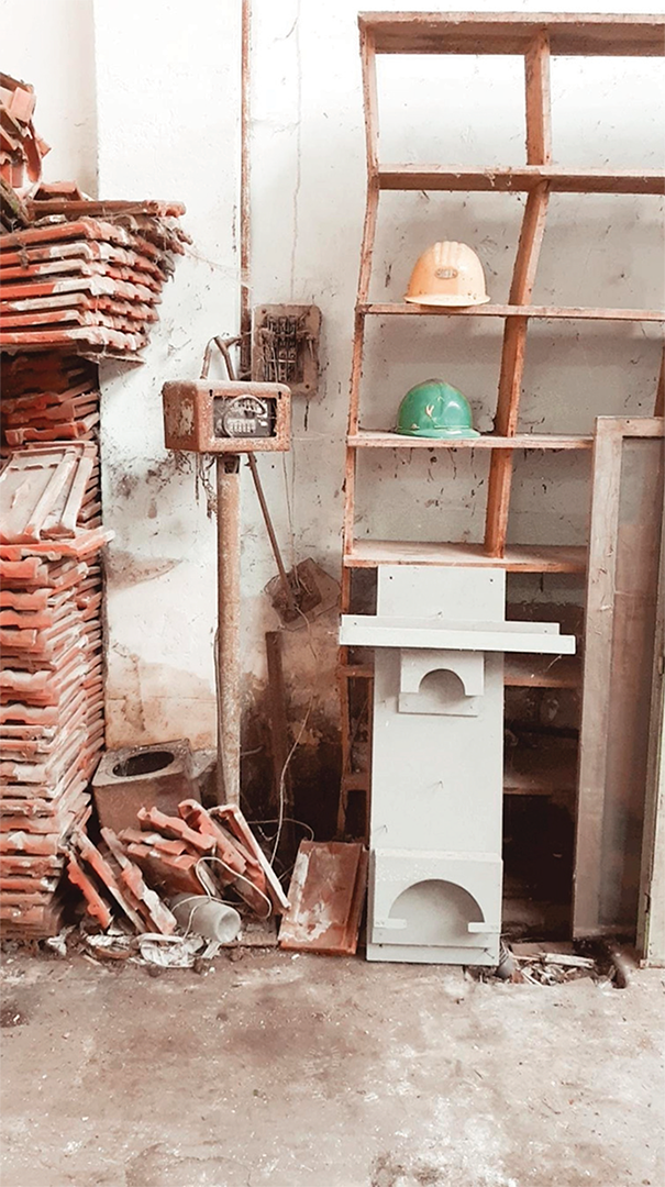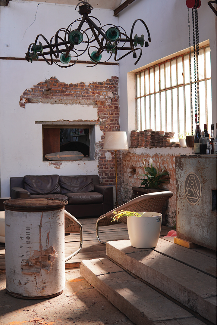 Notre rénovation sera rythmée par la réutilisation de toutes les portes, fenêtres, verrières remplacées ou déplacées et par le détournement d’objets comme ce que nous avons longtemps cru être un ancien four industriel qui est en fait une ancienne presse mécanique, et qui va se transformer en bar. Cela devient presque un jeu.