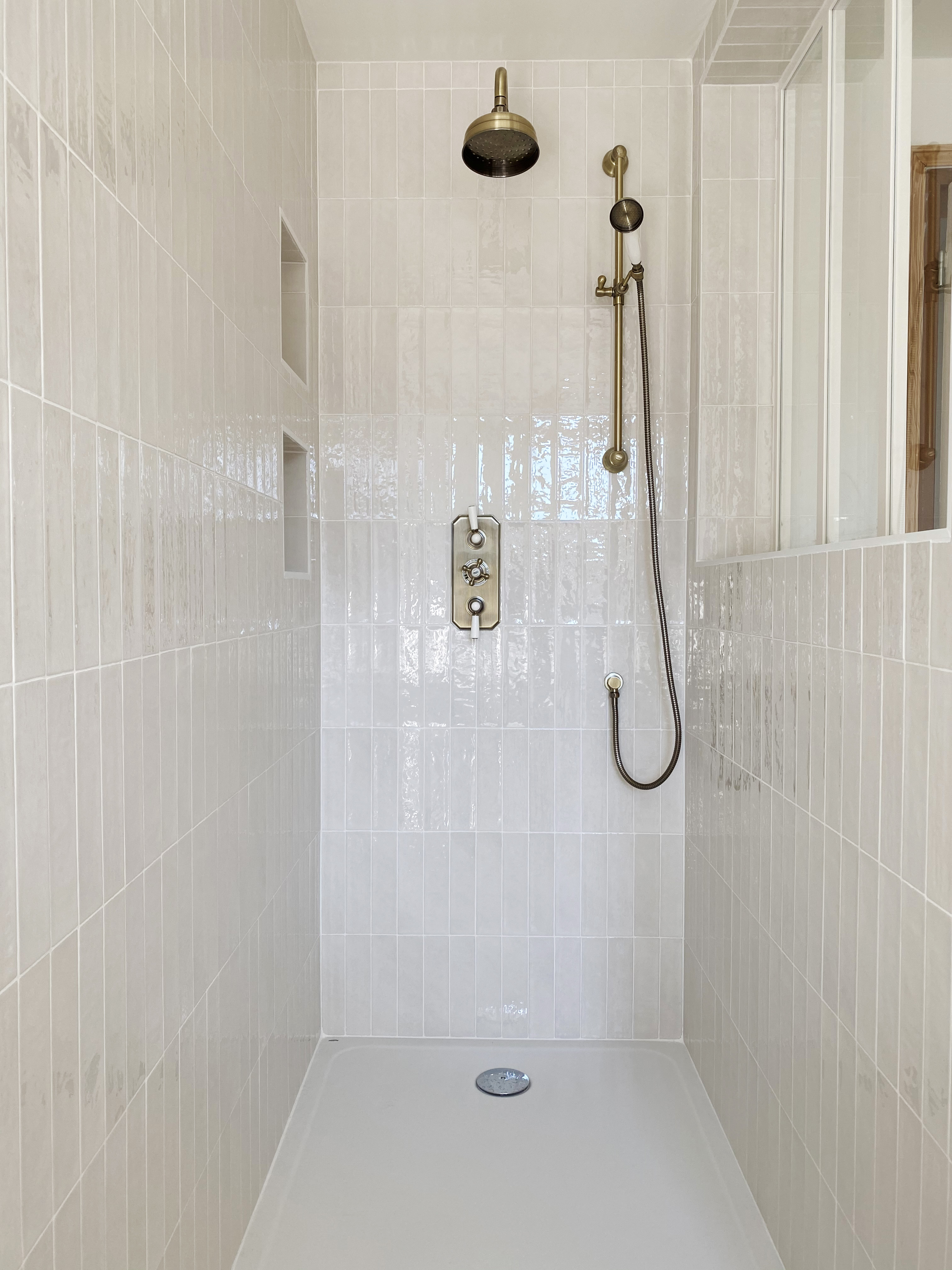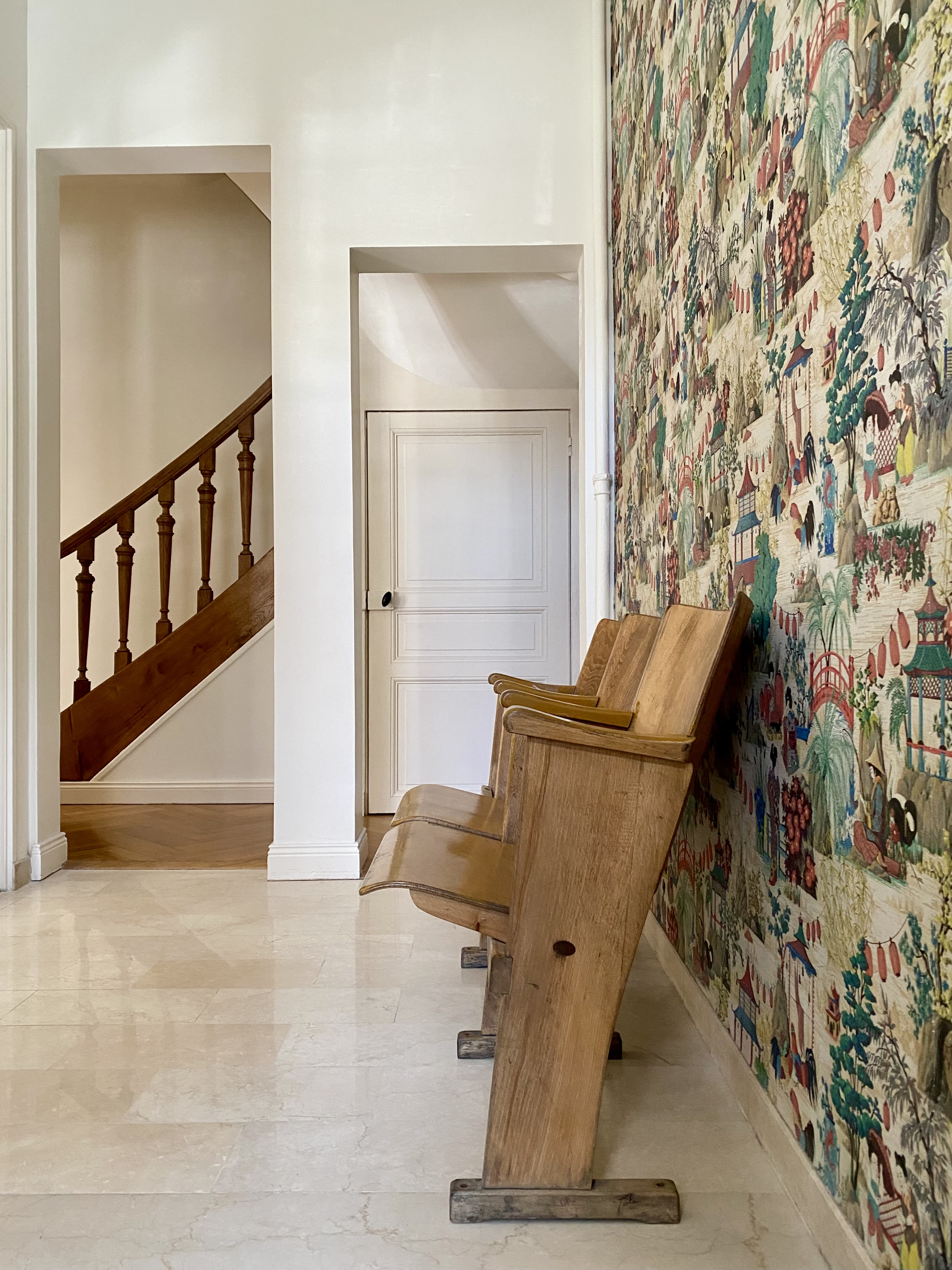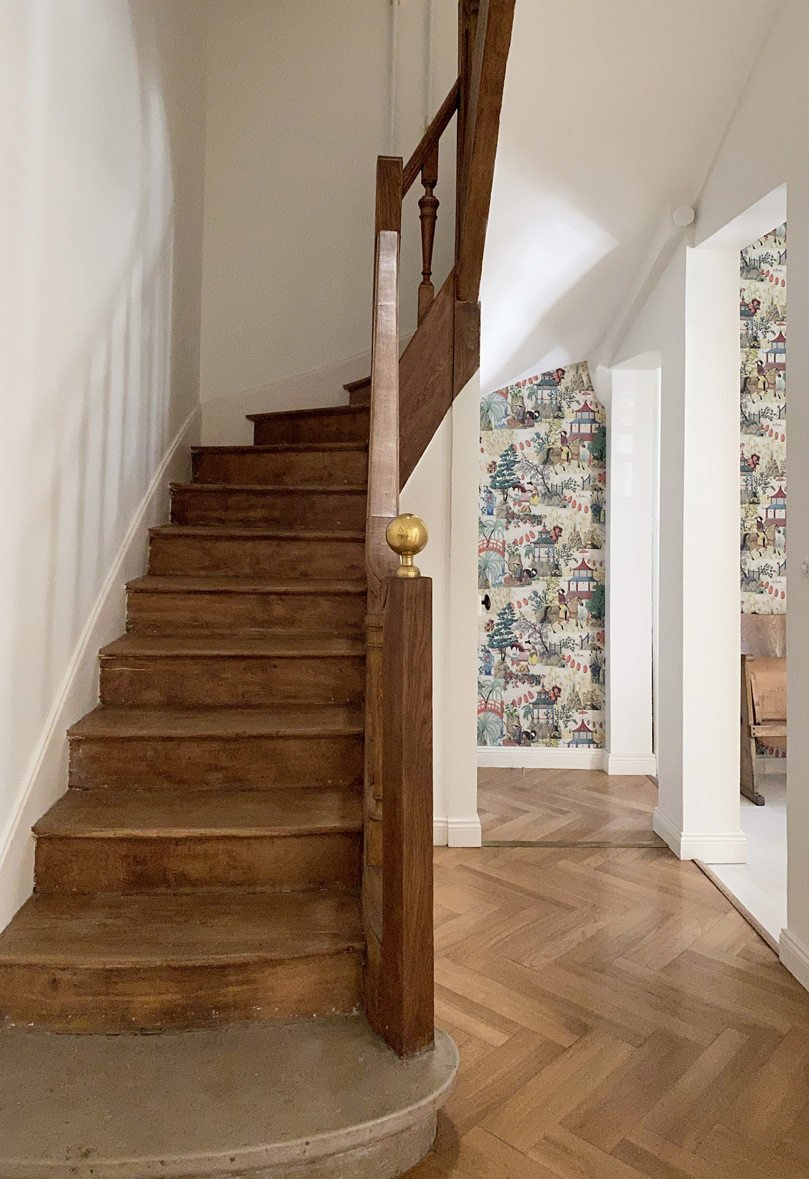 Oui, je t ‘avais laissé carte blanche, parce que je savais ce que tu faisais et j ‘avais cent fois confiance ! En revanche, j’avais deux contraintes. J’avais déjà choisi certaines choses, comme un papier peint que je voulais mettre dans l’entrée. Pour moi, ce papier peint est l’une des pièces maîtresses de cette maison, et en sus, il définit bien mon style. C’est un papier peint japonais de chez Pierre Frey Paris, composé de fils de pailles et assimilés. Ce n’est pas du fil d’or, mais quand on l’illumine, on le voit briller… il est rempli de couleurs que j’adore. Et puis, il y avait le laiton (rires)… parce que j ‘ai une passion pour le laiton. Ça, c’était vraiment mes deux seules contraintes. C’est vrai que je suis un peu une psychopathe ou un peu psychorigide sur ce sujet-là… j’apporte un intérêt important aux détails, ils sont très importants pour moi. Donc, j’avais envie de pousser le vice jusqu’au bout… comme intégrer des produits de qualité…, c’était un critère essentiel, pour que lorsqu’une personne rachètera cette maison, un jour, il puisse y trouver des choses de qualité. Alors évidemment, s ‘ils veulent tout changer, ils peuvent tout changer. Mais voilà, je trouve que ça fait partie d’une forme de transmission.