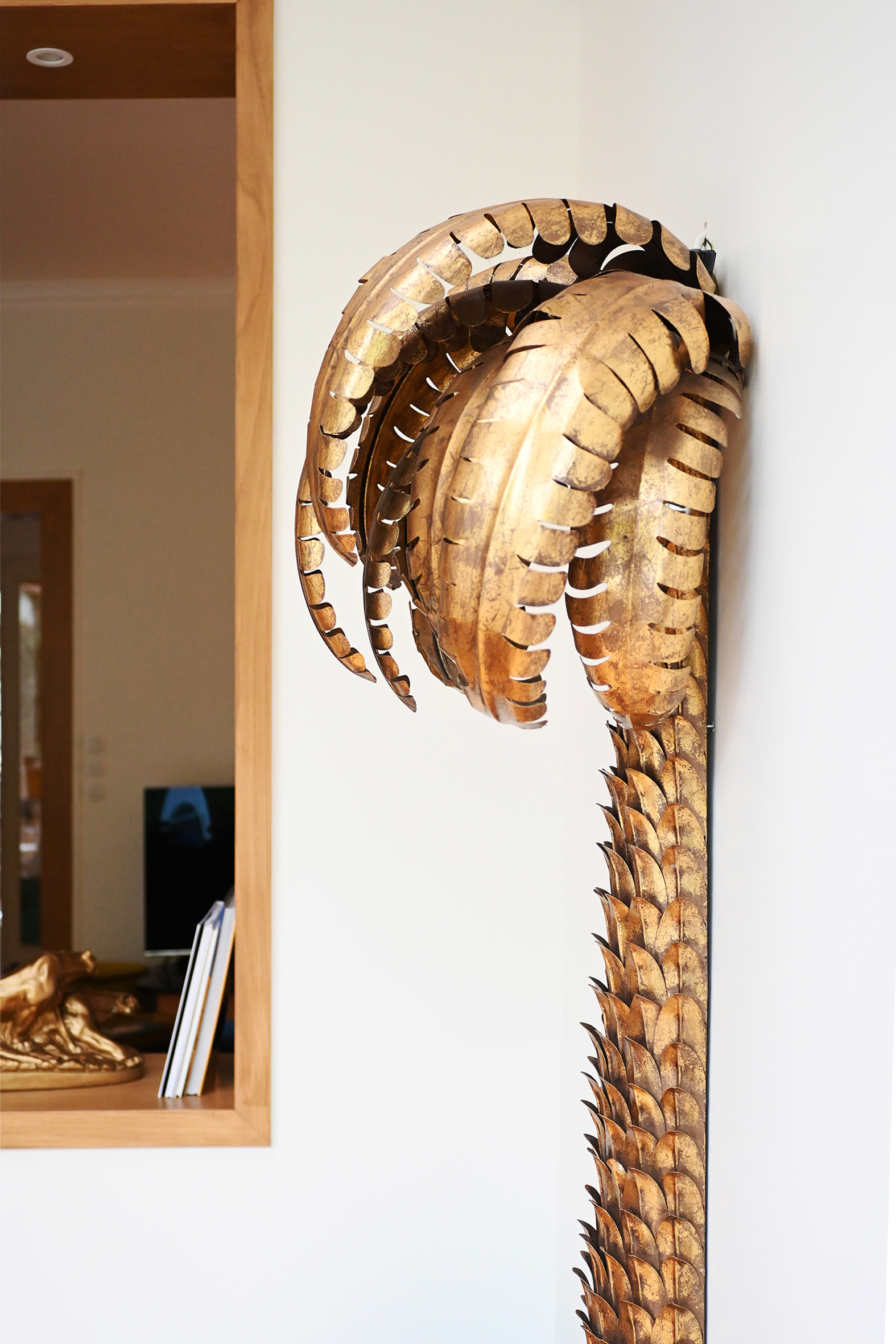 J’ai une grande passion pour les objets chinés et surtout pour les lampes, les luminaires, c’est vraiment important pour moi. Avoir de la luminosité partout plutôt chaude… je n’aime pas les lumières trop blanches, c’est vraiment ce que je déteste le plus. Il me faut des lumières chaleureuses et dépareillées, j’aime bien l’idée que tout ne soit pas uniforme. Comme quand on chine, on trouve des choses très différents, d’époques différentes. J’aime bien ce qui est un peu suranné, parfois, et kitsch aussi. Alors, ce côté kitsch, j’aime bien le retrouver dans mes lampes… j’ai des lampes ici coquillages, moules, fleurs, palmiers, etc. De chiner tout ces objets donne de l’âme. J’aime bien que cette maison me ressemble. Mais demain, si j’ai une autre maison, elle ne sera pas forcément complètement dans le même style. Je trouve qu’il faut l’adapter au lieu, à l’état d’esprit du lieu et de son environnement.
